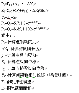 2.挠曲力:列车在桥上等速运行引起梁的挠曲,从而使梁面纵向纤维缩短产生与钢轨的相对位移所引起的纵向梁轨相互作用力。其大小与列车荷载和扣件的纵向阻力有关。伸缩力和挠曲力的计算公式可简化为: