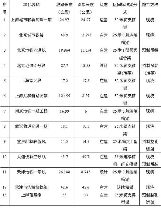 众所周知,伴随着新世纪的到来,中国的城市轨道交通建设也翻开了崭新的一页。目前中国人口过百万的三十四个城市中,有二十个超大城市和特大城市正在建设和筹建自己的轨道交通。目前在建的线路长度近400公里,这其中高架线路型式因其造价低、建设周期短而越来越受到决策者和设计者的青睐。据统计,在已建成通车的8条146.94公里的线路中,仅有一条高架线,长度占17%,而正在建设的16条线路中,高架长度已占到约40%。表1为已建项目高架线路情况统计。