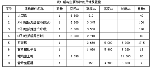 表1 盾构主要部件的尺寸及重量