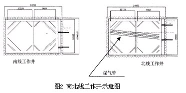 本次推进的盾构工作井净空比较小,南线工作井四角和中部都有支撑,将井空间分为两部分;北线工作井除了中部支撑和角撑外,中间还有1根φ600的煤气管,沿井的长度方向横穿整个井位,增加了盾构下井的难度。图2为南北线工作井示意图。