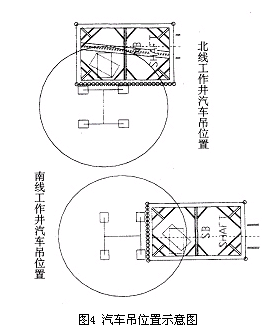 500t的汽车吊自重为150t,为了提高地基的承载力和减少对工作井的影响,在500t汽车吊的4个脚撑位置下面,设置并排双孔钻孔灌注桩基础(直径为900mm,深20m)和钢筋混凝土承台(厚1m),承台与汽车吊的脚撑位置一一对应。南线汽车吊停在工作井后井壁的旁边;北线汽车吊停在平行于洞圈侧井壁的旁边,见图4。?