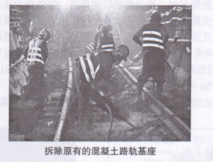 ①分拆除深入轨床以下的混凝土钢轨基座至钢筋外露。为使列车服务不会受阻,每5段间距650~750mm的轨段,只容许重建一段。