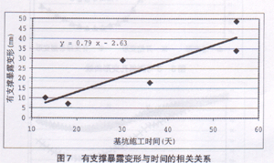 (3)有支撑暴露的最大变形与基坑施工时间近似成线性关系:y:0.785x-2.63;