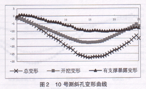 (1)约15d。图2为10号测斜孔开挖期间变形曲线,开挖总历时13d。由于开挖施工总时间较短因此有支撑暴露变形亦较小。有支撑暴露变形约占开挖期间总变形的1/3。