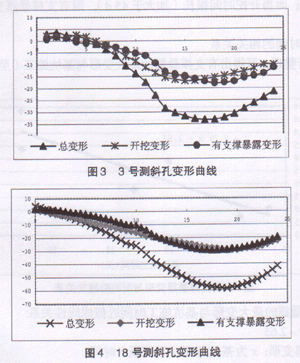 (2)约30d。图3、图4分别为3号、18号测斜孔开挖期间变形曲线,其中3号孔开挖总历时36天,18号孔开挖历时30天。此处施工速度比较常见,基本保持一周一层土。有支撑暴露变形约占开挖期间总变形的1/2。