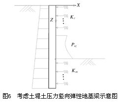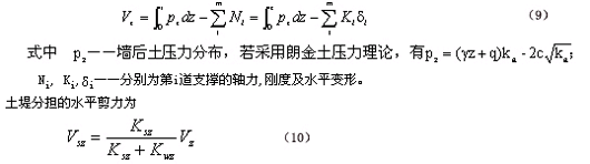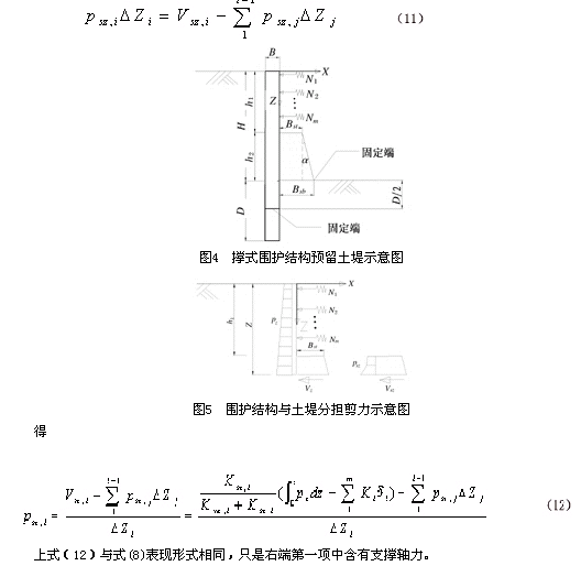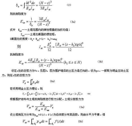 Ni, Ki,δi——分别为第i道支撑的轴力,刚度及水平变形。 土堤分担的水平剪力为 与3.1类似处理,将z处以上土堤分成若干小段,可求出任意小段ΔZi上的土压力
