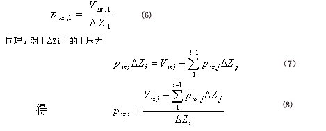 (2) 假设小段ΔZi上的土压力分布为psz,i,在该段上均布。 则对于ΔZ1,psz,1ΔZ1=Vsz,1,Vsz,1为第1小段底的土堤分担剪力,由式(4a)、式(4b)及式(5)计算求出。可得