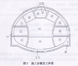 (1)通过对渡线大跨隧道开挖过程的三维非线有限元计算可知,采用超前注浆长管棚的双侧壁导坑法施工该大跨隧道是完全可行的,用此法施工时所引起的地表沉降可以控制在规定的范围之内。其施工步骤及工序图见图2。