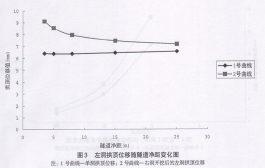 按埋深30m,围岩类另II-IV净距分别取3.5m、5m、8m、15m、25m等多种工况,计算了各种工况的毛洞开挖围岩的应力重叠区和拱顶位移,图2为III类围岩毛洞开挖的等效应力等值线图 (由于篇幅所限,其他工况等效应力图不再列出),图中等值线为等效应力等值线。图3为左洞拱顶位移随隧道净距变化图。