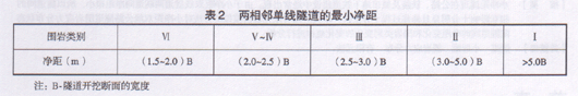 《公路隧道设计规范》中规定,两相邻隧道的剐、净距应按围岩、地质条件和隧道断面尺寸及施工方法等因素来确定。一般可按表2的数值取用。