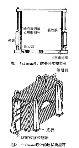 K.L.Fishman(1995)在试验中采用的模型箱的特点为:围护边界用销与底部连接,容许发生绕底部的转动变形;模型箱侧面用联系梁相连,使其与箱内土层的变形一致;边界材料有一定的柔性,尽可能反应土层沿竖向的变形规律。