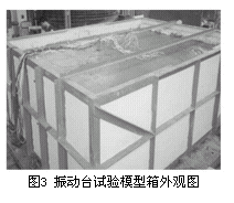 模型试验在同济大学进行,其振动台台面尺寸为4.0m×4.0m。图3为模型箱的外观图,模型箱的边界由焊接热轧等边角钢制成支撑框架,其内采用木板作为箱体侧壁。在与激振方向垂直的方向上,箱体壁面均衬厚175mm的模塑聚苯乙烯泡沫塑料板;而在顺沿水平振动的方向上,则均粘贴光滑的聚氯乙烯薄膜。在模型箱底部粘结了一层碎石,以免激振时模型土体与底板间发生相对滑移。模型箱高1.2m,沿振动方向的净长度为3.0m,垂直于振动方向的净宽度为2.5m,箱中土体高度为1m。