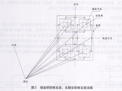 此方法虽然简单,但其精度不能满足要求。采用此方法调试的盖梁锚箱支座合格率极低,而且成品盖梁锚箱支座普遍超限。从精密导线点引测护桩,再用护桩控制盖梁轴线,支座的平面坐标及法线均靠盖梁轴线及支座切线护桩控制,其精度等级逐渐降低,也无法满足支座高精度的要求。同时支座法线没有得到有效控制,轻轨支座验收标准中的支座平面角度控制在±3/1 000rad内,是指支座在法线方向的扭角须控制在10'19''内,即支座上法线上两控制点到盖梁大法线的距离与设计长度的差值相差小于2.8mm。此方法通过护桩只控制了支座切线上的两控制点,法线上的两控制点未得到有效控制。