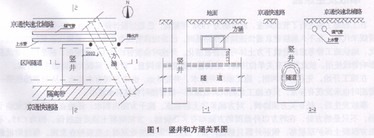 竖井占京通快速路北辅路南半幅,竖井北侧有*600上水和*500燃气管线,竖井南侧紧邻京通快速路。如图1。地铁隧道从竖井向东西两侧开挖。