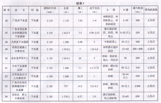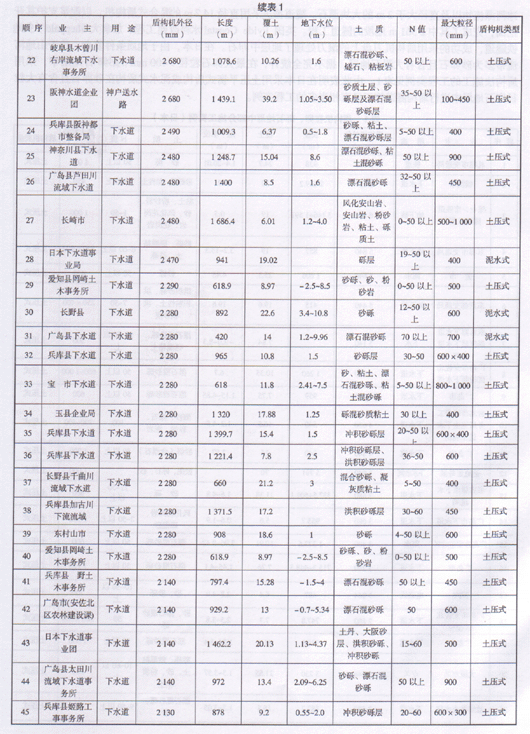 表1表明在日本含大粒径漂石的砂卵石地层中多采用土压平衡式盾构机施工。另外《隧道标准规范(盾构篇)及解说》(日本1996年)中对盾构施工现状问卷调查表明,目前在日本类似成都地质条件地层中加泥式土压平衡盾构使用的工程范围远大于泥水式盾构。(注:泥水加压式盾构即为泥水式盾构,泥土压式盾构即为加泥式土压平衡盾构)成都市地铁一期工程区间隧道可采用泥水式盾构或加泥式土压平衡式盾构,但经以上技术、经济比较及参考类似工程经验,推荐加泥式土压平衡盾构。