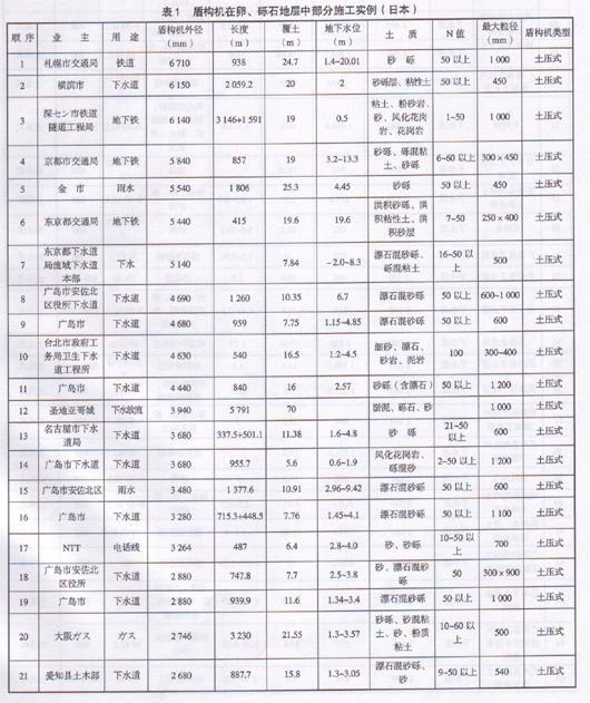 如瑞士的Grauholz隧道是—座长5.5km的铁路双线隧道,内径10.6m。通过地段地质十分复杂,由于冰河时代阿尔卑斯山的冰川汇人该地区,松散的土壤沉积物构成了该地区的整个地质构造:粘土、细砂、中砂及卵石,还可能遇到抗压强度高达200MPa,尺寸超过几米的大块砾石。由于隧道两端洞口区段由富含地下水的松散沉积物构成,中间段通过稳定岩层,盾构机选用直径为11.6m的混合式盾构,在松散地层中采用泥浆盾构的开挖方式,利用锚固在刀盘上的刀具切割大砾石,在岩层地段采用敞开式掘进方式。又如德国汉堡4座易北河公路隧道,隧道长3.1km,内径12.35m,隧道沿线遇砂、淤泥、冰河漂流物以及直径大于2m的大块漂石。隧道掘进采用直径14.2m的混合式盾构机,以泥浆支护其开挖面,完成了其中2 561m地段的隧道工程。英国Fylde Coastal水利改建工程、加拿大Shcppald大街地铁隧道,成功的采用盾构机刀盘上的滚刀处理了地层中卵石。在日本,由于地质条件复杂,位于山地河流带多为砂卵石且含有大漂石地层。据不完全统计,在最大卵石粒径>400mm的砂卵石地层中,采用盾构法施工的工程实例见表1。由此表明在日本采用土压平衡式盾构或泥水式盾构在砂卵石且含有大粒径卵石地层中进行盾构隧道施工已有相当多的工程实例。