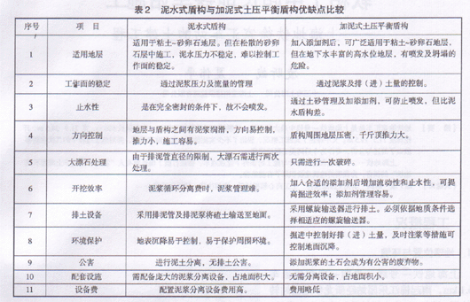 以下从十一个方面对泥水式盾构和加泥式土压平衡盾构进行比较(表2)