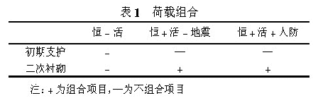 设计计算中,根据施工和使用阶段可能出现的最不利荷载进行组合(见表1)。施工阶段按水土合算计算土压力,只考虑初期支护的承载作用;使用阶段按水土分算计算土压力,二次衬砌按承载结构设计,承受全部的水压力和所分配荷载,初期支护和二次衬砌之间的荷载按刚度分配。