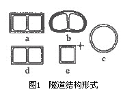 由于地质条件和施工条件的限制,皇岗——福民区间隧道的施工采用了多种不同的施工方法,隧道结构形式也做了相应的改变。暗挖法施工区段:SCK0+630—SCK0+655采用矩形复合衬砌(见图1a),SCK0+740-SCK0+834采用单拱双跨马蹄形复合衬砌(见图1b),SCKI+56.25-SCKI+499.307采用圆形隧道断面(见图1c)。明挖法施工区段:SCK0+655-SCK0+740和SCK0+ 834-SCK0+967.332采用双跨矩形结构断面(见图1d),SCK0+967.332-SCK1+56.25采用单洞单线矩形结构断面(见图1e)。