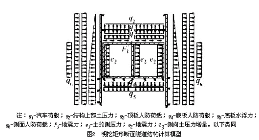 采用明挖法施工的矩形断面隧道,计算模型如图2所示,隧道结构受地层弹性约束,作用土主动荷载。计算模型假定地层不仅对衬砌结构施加主动荷载(地层的主动土压力),而且还施加被动的弹性抗力,弹性抗力采用弹性地基梁理论确定。对于桩墙组合结构,桩墙之间只传递压力,不传递剪力和弯矩。