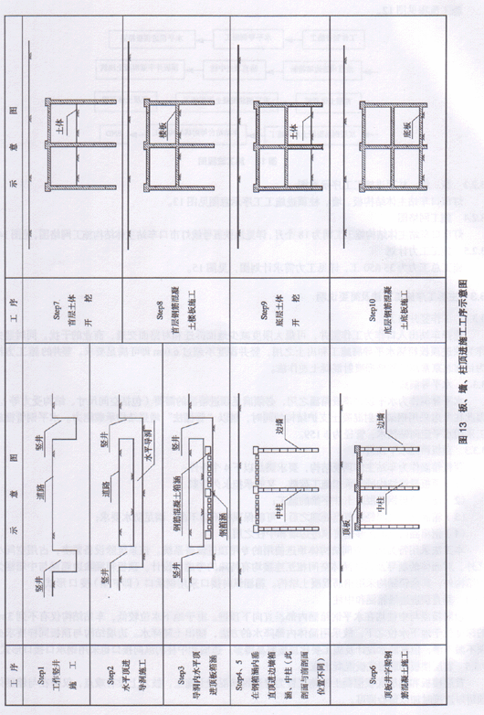 灯市口车站主体结构板、墙、柱顶进施工工序示意图见图13。