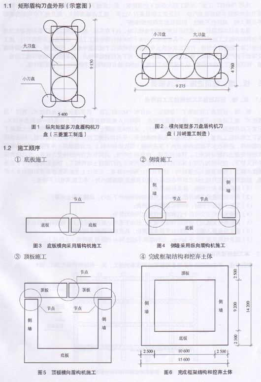 日本是开发地下空间较超前的国家之一,在20世纪80年代末期,仅地下商业街的使用面积就已超过82万平方米,地下工程施工技术相当发达。20世纪90年代,笔者在日就职期间参与过采用“管棚法”技术施工大断面隧道的施工管理(该隧道开挖面积约90平方米,长度近100m)。此外,还跟随原在日本国铁研究所工作过的著名盾构专家植野老先生(现已去世),共同研究过利用小型矩形盾构施工大型地下空间的施工技术。此项技术现经日本其他企业研究和开发,已应用到实际工程中。如东京高速川崎纵横线KJ125工区(B,C)通风道即采用该工法(Multi-MicroShieldTunnel简称MMST工法)施工。其过程可简述为采用纵横各一台小型矩型多刀盘盾构机,先施工通风道框架结构,再挖弃通风道框架结构内土体,最后完成通风道施工。小型矩型多刀盘盾构机刀盘外形和“MMST工法”施工顺序示意图如下。