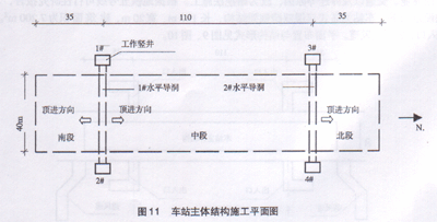 利用4个出人口作为工作竖井,先施工顶进水平导洞,利用导洞水平双向顶进顶板箱涵,然后在箱涵内垂直顶进边墙和中柱,同时在顶板箱涵内施工钢筋混凝土梁板结构(井字粱),最后逆作首层楼板和底板混凝土结构。车站主体结构施工平面布置见图11。