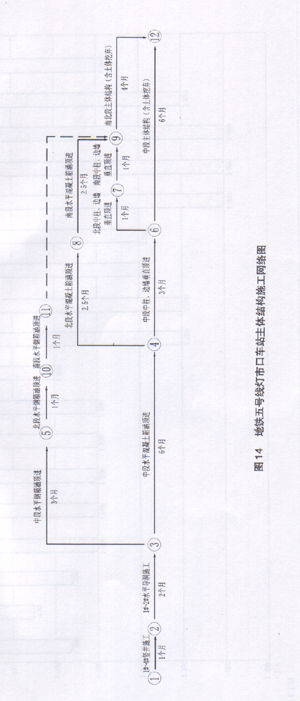灯市口车站主体结构施工工期为18个月,详见地铁五号线灯市口车站主体结构施工网络图,见图14。