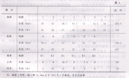 大容量快速客运系统是解决特大城市客运交通的根本途径,从第——条地铁建设开始起要不停顿地快速建造。远期规划地铁、轻轨、高架公共汽车三种模式的快速大容量系统,其主要指标列于表1:
