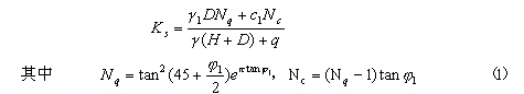 根据南京地区近年来基坑的工程实践经验,以及南京市地基基础设计规范建议,基坑抗基底隆起的稳定检算可采用考虑c,φ的抗隆起法,计算示意图如图1所示,抗隆起稳定性的公式为