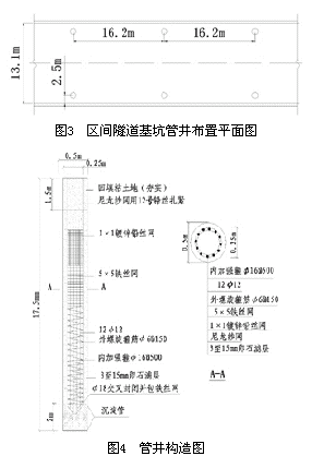 管井布置在离基坑壁2.5m处,纵向间距为16.2m,两边各布置72个,井深17.5m。管井布置平面图见图3,管井构造图见图4。