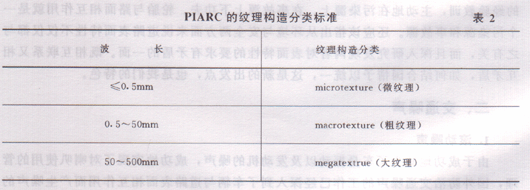 PIARC(国际道路会议常设委员会)提出texture分为mlerotexture、macrotex)。为了把道路表面特性区分为texture与roughness(或ND—我们把texture译成纹理。这样,按PIARC的划分标准如PIARC的纹理构造分类标准如表2