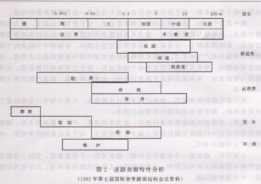 道路表面特性是一个国际上正在深入研究的新的领域:一方面正在从经验向建立理论体系转化,另一方面正在由滑溜、噪声等个别问题向多功能、全功能方向转化。图2是近年来认识的一个阶段总结。高速交通对路面有舒适性、经济性、安全性和环境的四大功能要求。在经济效益这一节里我们分析了道路表面构造深度对燃料、零件、轮胎等不同车辆运营费用有着敏感影响的不同分布的频带范围。图2还反映了构造深度对其他三个功能起影响作用的频带范围:噪声——粗纹理与大纹理;摩擦——微纹理为主;粘结——粗纹理;接触——大纹理与短波长;低速交通下的舒适性——短波、中波与大纹理;高速交通下的舒适性——短波、中波与长波。还有一些新的功能问题正在开始,例如眩目、视觉疲劳这个与交通环境、交通安全相关的问题。