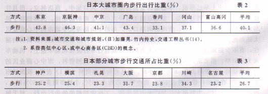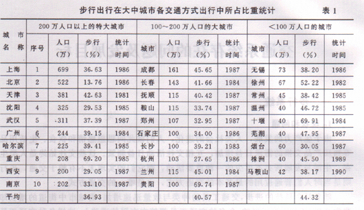 据已有的观测资料(表1)表明,我国城市步行交通,在总出行量中约占40%,而中等城市约占45%,小城市则多达50%以上,因此,解决好这一为数很大且与广大市民生活、工作密切相关的步行出行,对于解街道上过街的行人流量也相当大,据统计,高峰小时的人流量,北京西单北大街和崇文门路口分别为1.2万人、0.35万人,上海的延安东路、静安寺、四千路、徐家汇等均为1.2~2.2万人,广州的中山路、延安路、北京路、起义路也在0.5~1.9万人之间,武汉、重庆、南京中心地带的高达o.5~2万人。日本几个大城市圈内的调查资料统计,步行出行比重一般稳定于40%左右(表2)。美国旧金山市的调查表明,步行出行比重占16%,纽约市曼哈顿的交通组成统计,小汽车与出租客车1小时内总的行程为58万人英里,公共汽车1小时内的总行程为31万人英里,步行人1小时内的总行程为96万人英里,约占该区地面交通总行程52%,即占总客流量的一半以上(摘自美国运输与交通工程手册224页)。在市中心地带如纽约市的第五号大街,步行交通量高达2.5万人/h,美洲大街为1.0万人/h。在日本的东京、大阪、名古屋的步行比重占全部交通总量的25%以上,据日本“街道の计画与设计”中所载的统计(表3),城市中心地区的步行量比重往往更大。