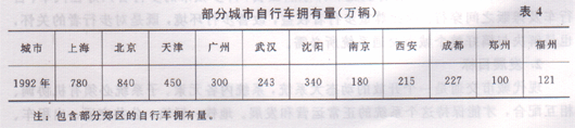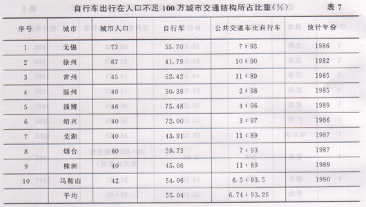 我国是名副其实的自行车王国,无论在自行车的生产量、拥有量及城市使用水平方面都居世界首位,目前自行车的年产量约为3000多万辆,全国自行车的拥有量约为4亿多辆,平均拥有水平约为每三人一辆,其中城市居民拥有量约占全国总量的一半,骑车适龄人口的拥有水平为每人一辆,大多数城市自行车的拥有量已接近饱和或即将饱和。近十年内城市自行车平均年增长率约为12%左右,在城市内主要是更新,现将部分大城市的自行车的拥有量及近年来自行车出行比重列于表4、5、6、7,从表中可知各大城市的自行车拥有量已经饱和。各城市自行车出行比重相差较大,200万人口以上城市自行车出行量占城市总出行量的25%~55%,除重庆市因山地道路坡度陡峻,不适合自行车骑行之外,其他城市均在25%以上,平均为36%,自行车平均出行量已大大超过公共交通车的出行量。100%~200万人口城市的自行车出行比重在23%~63%之间,平均值为42.4%,自行车与公共交通车出行量平均值之比为72:28。即自行车担负出行量已超过公共交通担负的出行量的2倍以上。人口不足100万人的城市, 自行车出行比重更大,一般在40%一75%,平均值约为55%,自行车与公共交通车负担出行量平均值之比为93:7,即公共交通车的客运量仅为自行车客运量的1/13。