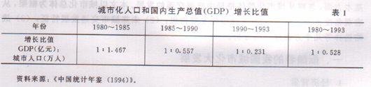 城市化人口和国内生产总值(GDP)增长比值 表1