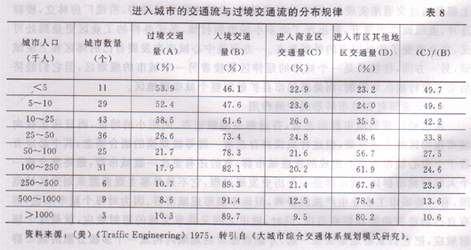 但是,伴随着城市群地区内向性交通流的强化,各城市内部交通会受到恶化的回报,特别是处在终点地区的核心城市,表现为进出城市的交通流和过境交通强度的增加。国外经验资料表明,过境交通的比重随着城市人口规模的增大而递增,而出入市中心区的交通比重,规模越大则比重越小(表8),这在我国也同样存在这种交通流分布规律,在大城市,由于人口基数大,导致城区与郊区接合部的道路压力相当大,交通经常堵塞,进城通道“瓶颈”制约十分突出。有些城市采取只容许重型货车夜间入城的办法,轻型货车则每日按车号的单双数轮流行驶,这只是一种权宜之计,对城市经济发展肯定会产生不利影响,有时夜间货车进城也会造成一些相当严重的交通事故。