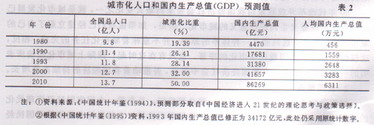 城市化人口与国内生产总值增长有着相关的因素,我们按此关系进行分析,便可以概略看出未来城市化目标。据资料,1980~1993年13年中,GDP每增长1亿兀,城市人口相应增长0.528万人,考虑到今后二三十年我国经济仍然处在高速增长阶段,这个比值可以作为经济高速发展时期城市人口增长的一个参数(表1)。