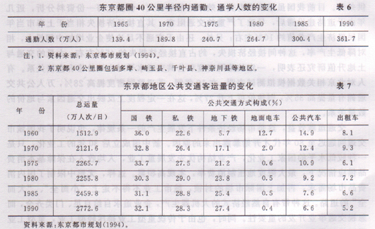 国外经验表明,发达国家城市产业结构高度化,在空间上主要依赖于郊区城市化和中心商业区的再开发,从而使市中心人口锐减,大量居民向郊外迁移,形成规模庞大的交通通勤流,所以,这些城市非常重视交通的先导作用和持续效应,把城市交通问题作为一项长期的战略任务来实施。例如日本的东京,1990年,东京都半径40公里圈内每天到市中心通勤人数,已从1965年的139.4万人增加到361万人,25年增加1.6倍(表6)。为了解决这些远距离的通勤流量,东京在历次经济发展计