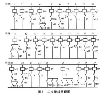 (2)现在分析I段进线电压恢复正常(≥180V)时,1ZK、3ZK自复过程的完成:由于I段进线电压恢复正常,故图4中继电器Al线圈失电,A1常开点分开--回路1中T1线圈失电,T1常开点瞬时断开--回路2中Ml线圈失电,M1常闭点闭合;此时考虑Ⅱ段进线电压正常,A2线圈无电,A2常开点分开--回路17中T2线圈无电,T2常开点断开--回路l 8中M2线圈无电,M2常闭点闭合: 由于3ZK在合位,因此输入到13的3ZK常开点闭合--回路14中M5线圈受电,M5常开点闭合,这样M1、M2常闭点闭合,M5常开点闭合--回路l 3中M14线圈受电,M14常开点闭合--回路25中T7线圈受电,由于T7常闭点延时0.5s断开,因此M14常开点闭合又保证了回路26中T8线圈受电0.5s,T8常开点延时0.1s闭合--回路29中Q5受电--控制3ZK分闸。