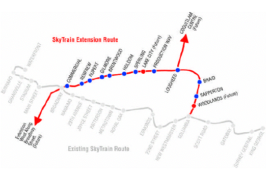 加拿大温哥华Skytrain系统始建于1981年5月,一期工程21.4km的线路于1986年1月投入运营。目前运营的线路包括全长28.9km的EXPRO线和20.3km新千年线,总长度达49.2公里,其中隧道线路4.1km,地面线路4km,高架线路41.1km。共建有车站34座,其中地下车站4座,地面车站4座,高架车站26座。车站站台形式主要采取岛式或侧式,站台长度地下为100 m,地面和高架站台近期为80m,预计远期可发展到100m。Skytrain的线路图如下: