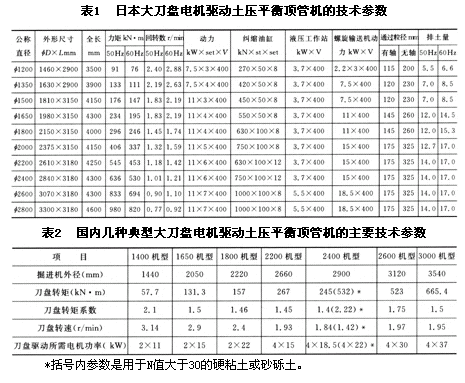 表1 日本大刀盘电机驱动土压平衡顶管机的技术参数