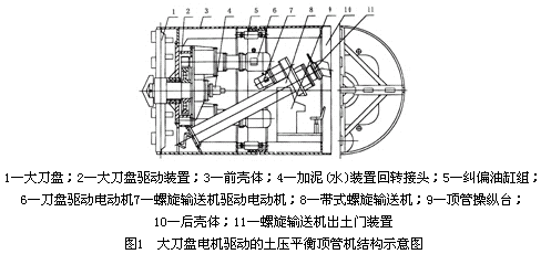 2.2.7 该类顶管机在出洞施工时不需液压动力设备的二次转换工艺,整套设备结构简单、施工方便、可靠性好。图1为大刀盘电机驱动的土压平衡顶管机结构示意图。