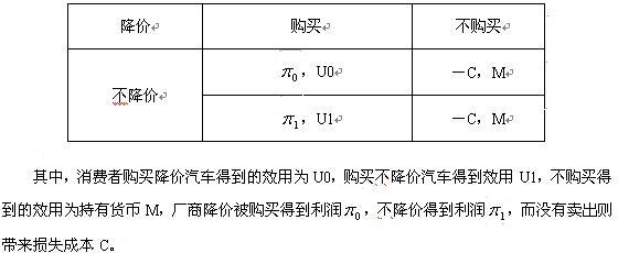 ,而当T趋近于0 的时候,该折现因子趋近于1,二者效用相同,消费者有可能选择在T期购买,否则,总是选择在第0期购买得到的效用更大一些。因此,可以说,在一般的经济学假设情况下,消费者应该早点购买汽车会带来更大效用,那么目前这种情况显然是由于厂商没有进行一致的定价行为,不断降价,造成了均衡价格不断改变,影响了消费者行为,使得对待汽车和对待普通耐用商品有所不同。 为了更清楚说明问题,可构造一个博弈来加以分析。假设厂商可以选择降价或者不降价两种行为,消费者可以选择购买或者不购买两种行为,构造矩阵如下: