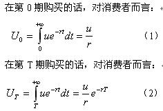可以看出,消费者选择在第0期或者第T期购买,取决于对二期购买得到效用的比较。而从(1)(2)的比较中可以看出,差别在于存在折现因子