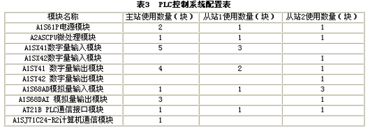 PLC控制系统采用日本三菱公司的MELSEC AnS系列可编程序控制器,该系统由一个主站和两个从站组成,具体配置见表3。