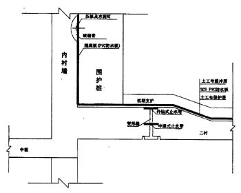 本工程围护结构兼作车站结构的一部分,因此围护结构为地下车站防水的第一关。围护结构采用φ1200人工挖孔桩,刚性咬合形式,以形成有效防水屏障。主体结构顶板采用聚氨脂防水涂料,侧墙和底板均采用PVC塑料防水板,主体结构典型横剖面防水见图1。变形缝和施工缝处均采用PVC外贴式防水带和中置式钢板腻子止水带进行防水处理。