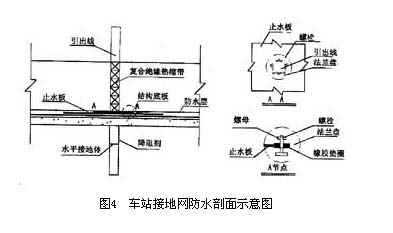 在车站底部接地网引出线穿过底板防水层,使底板防水层出现客观洞穿,此处外防水需进行特殊处理,现采用法兰盘式防水。法兰盘为环状,内径略大于钢管外径5cm。在地面将中间有孑L的防水板压在两法兰盘之间,螺栓固定,防水板两侧加垫板。施工时将法兰盘连同防水板套在钢管外侧,与周边防水板焊接一起。待防水板铺设完成后,进行混凝土灌注。施工时法兰盘两面要进行除锈、磨光,法兰盘周围及螺栓孔处、防水板上、下面均涂抹SBS沥青防水密封,详见图4。