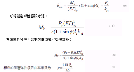 隧道弹性极限弯矩可以由隧道与等效梁在离中性轴距离最大处的变形协调条件得出。当隧道离中性轴距离最远的螺栓开始达到屈服时,那么等效梁的ls段也开始进入屈服状态,此时等效梁的弯矩就是隧道弹性极限弯矩。