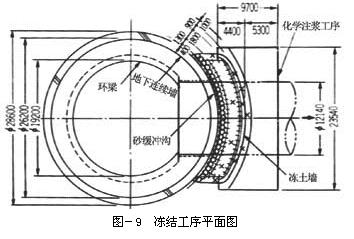 为了冻结相当于造成冻土厚度的地基土,在图-9中所示的3排冻结管(距离地下连续墙第一排、第二排和第三排)中,循环-30℃的冷却液进行冻结运转。不过,对于本工程而言,必须最大限度地限制和地下连续墙邻接的砂缓冲沟和砂取样对冻结膨胀的吸收。为此,砂缓冲沟内的每一排冻结运转推进40天左右的时间,造成大部分的冻土(第二、第三排)在冻结终止后冻结,完成开挖面处所需要的冻土墙造成。此外,为了确保冻土墙和地下连续墙的冻结,在地下连续墙和工作井井壁之间埋设的冻结管道和固定在地下连续墙开挖面上的冻结管,提前40天进行冻结运转。